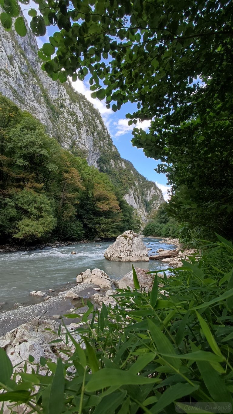 С обзорных точек маршрута открывается впечатляющий вид на ущелье Ахцу, где проходила ныне закрытая историческая дорога с народным названием «Пронеси Господи!». Внизу ущелья течёт река Мзымта — самая длинная река Сочи, создавая масштабный и запоминающийся пейзаж.